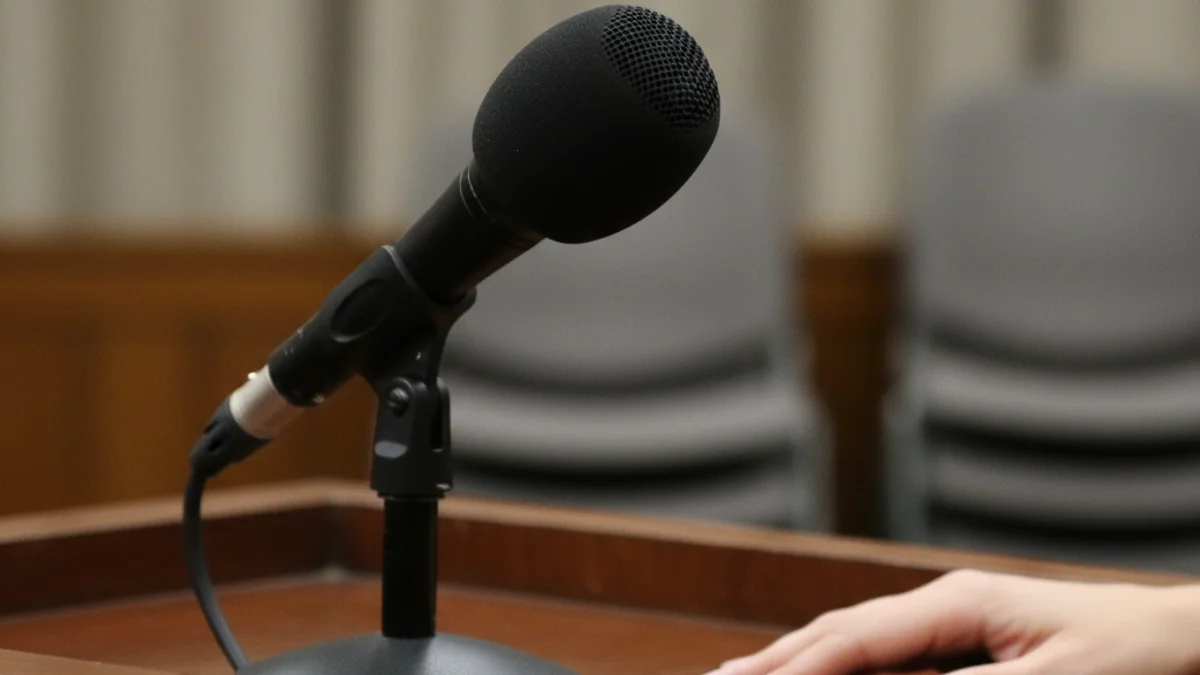 Una silueta d'una dona advocada parlant en un podi o davant d'un micròfon en un context de sala de premsa o tribunal.
