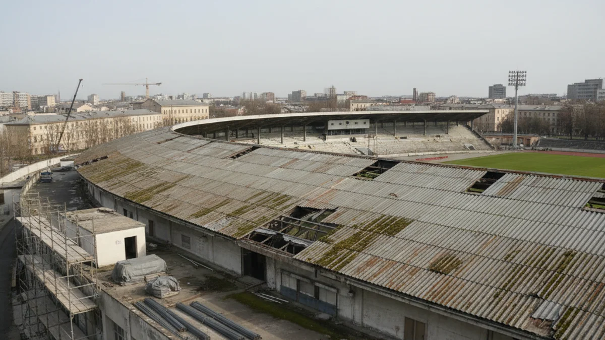 Imatge genèrica d'un pavelló esportiu amb la coberta en obres o amb signes de deteriorament.