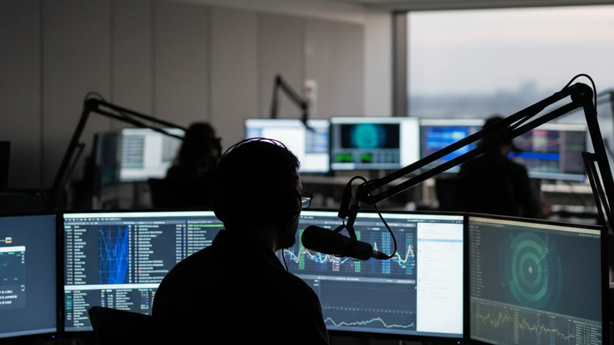 Un periodista treballant en una redacció de ràdio moderna, amb auriculars i un micròfon, en un entorn professional.
