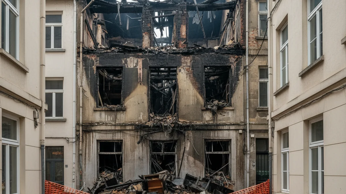 Imatge genèrica d'un edifici residencial greument afectat per un incendi, amb danys estructurals visibles.