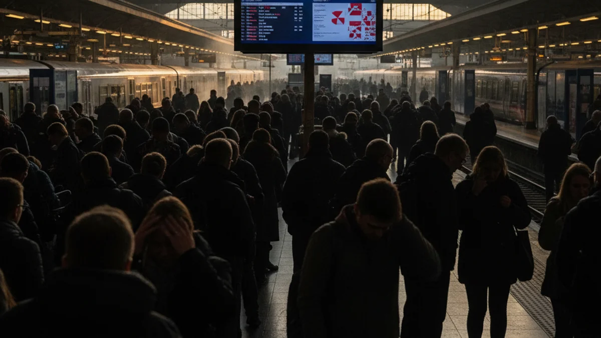 Imatge genèrica de viatgers frustrats esperant a l'andana d'una estació de tren amb pantalles d'informació.