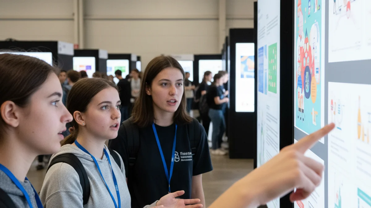 Joves estudiants de secundària i universitaris interactuant davant de panells informatius en una fira d'orientació acadèmica.