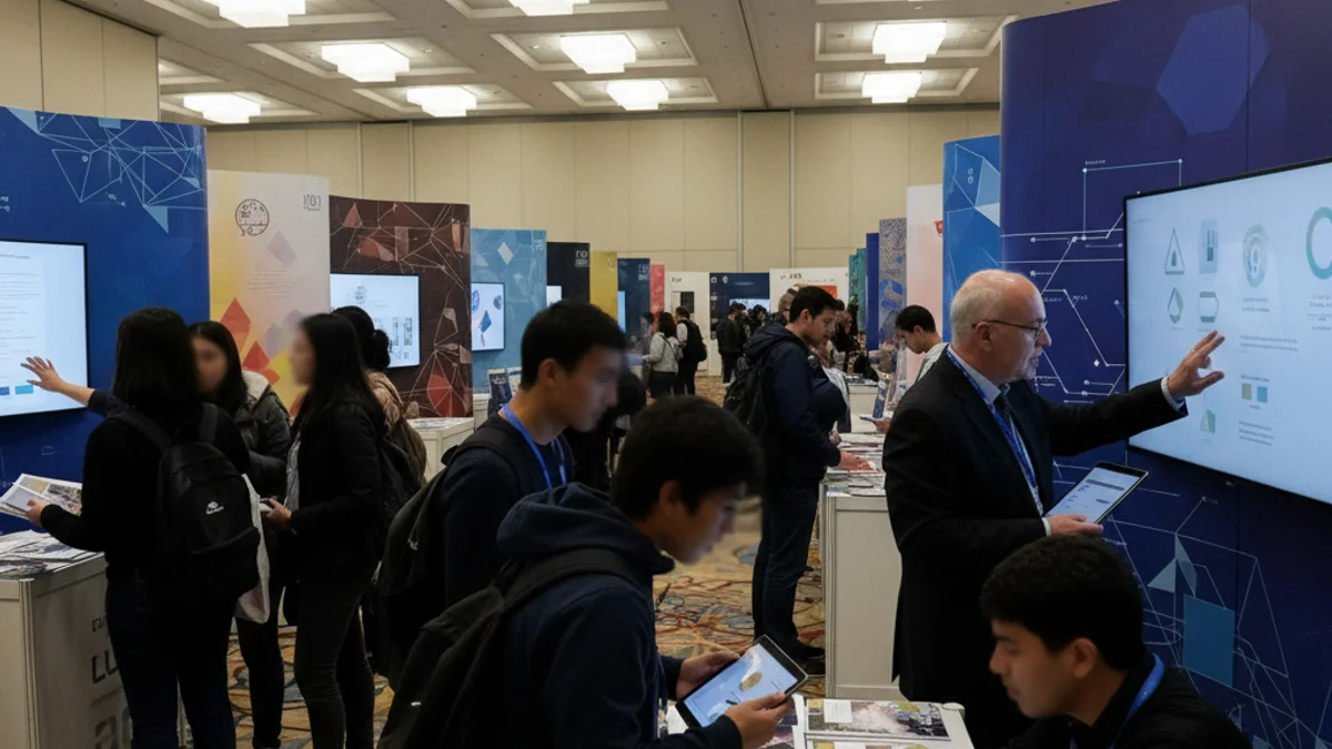 Joves estudiants consultant panells informatius sobre estudis universitaris en una fira d'orientació.