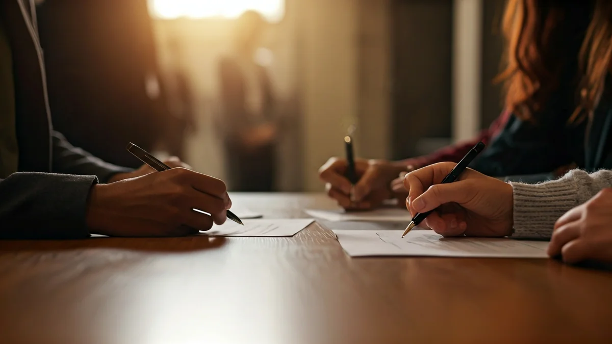 Imatge genèrica de diverses mans signant documents en una taula de fusta, simbolitzant la contractació i la col·laboració.