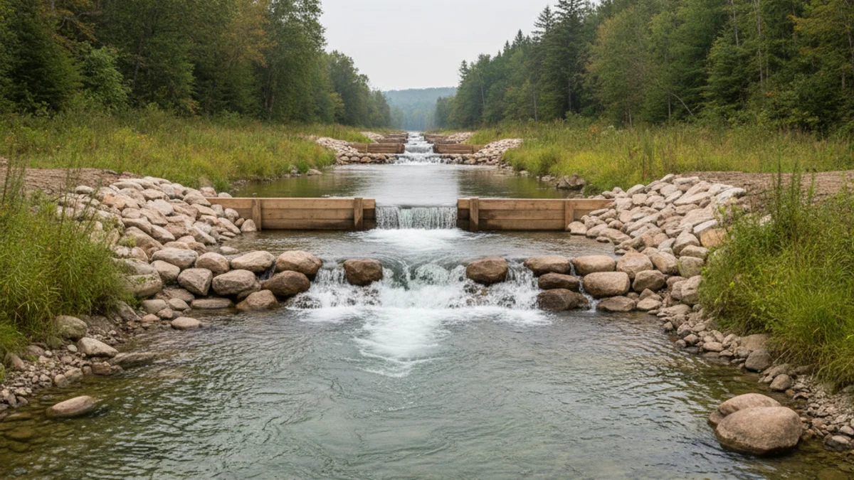 Imatge genèrica d'un tram del riu Ebre amb una rampa de peixos instal·lada per facilitar la migració.