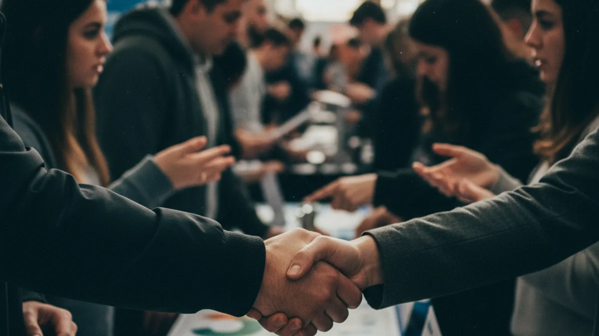 Joves i famílies interactuant en un estand d'orientació professional durant una fira d'educació.