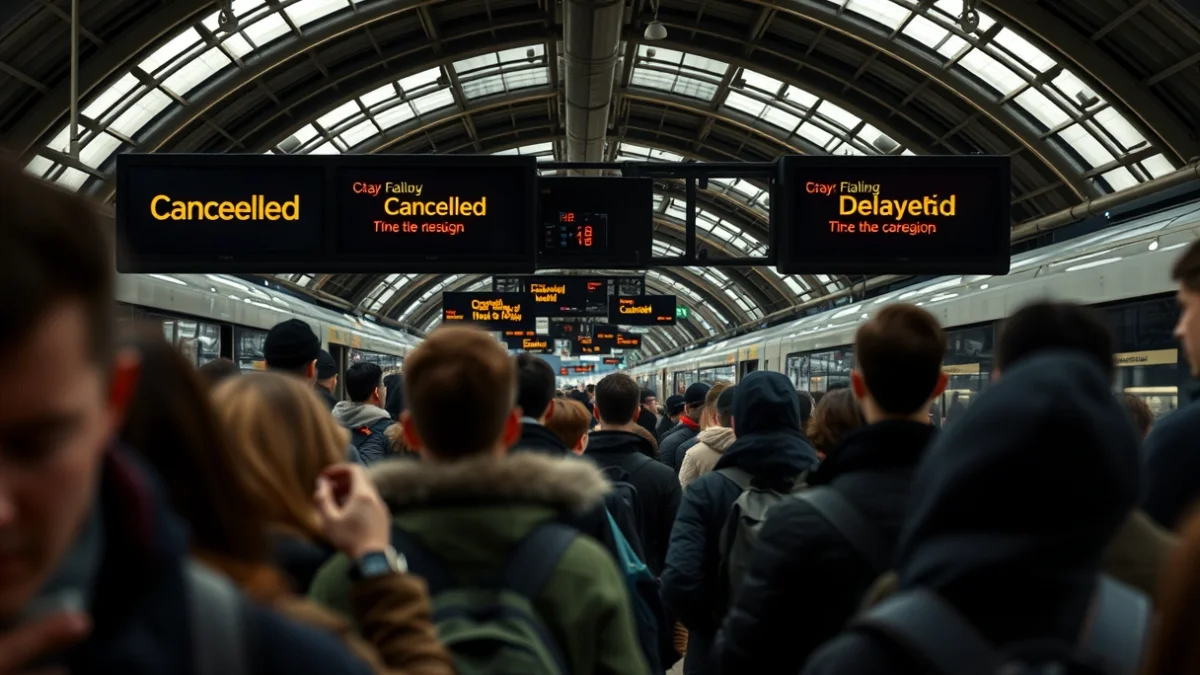 Imatge genèrica de l'andana d'una estació de tren amb pantalles d'informació que mostren cancel·lacions i retards.