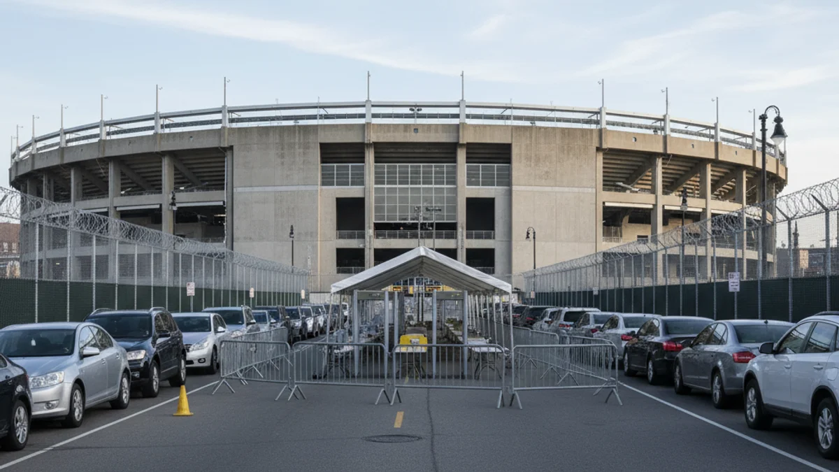 Entrada d'un estadi de futbol amb tanques de seguretat i focus, sense gent.