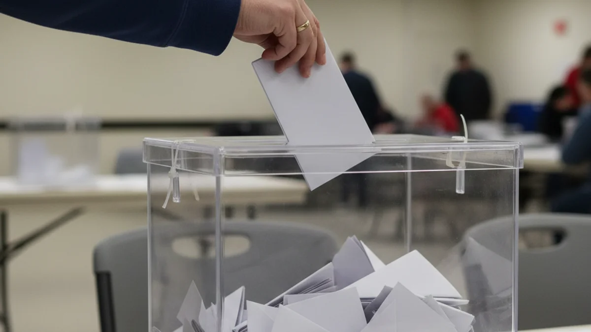 Una mà dipositant un vot en una urna electoral, simbolitzant un plebiscit o eleccions municipals.