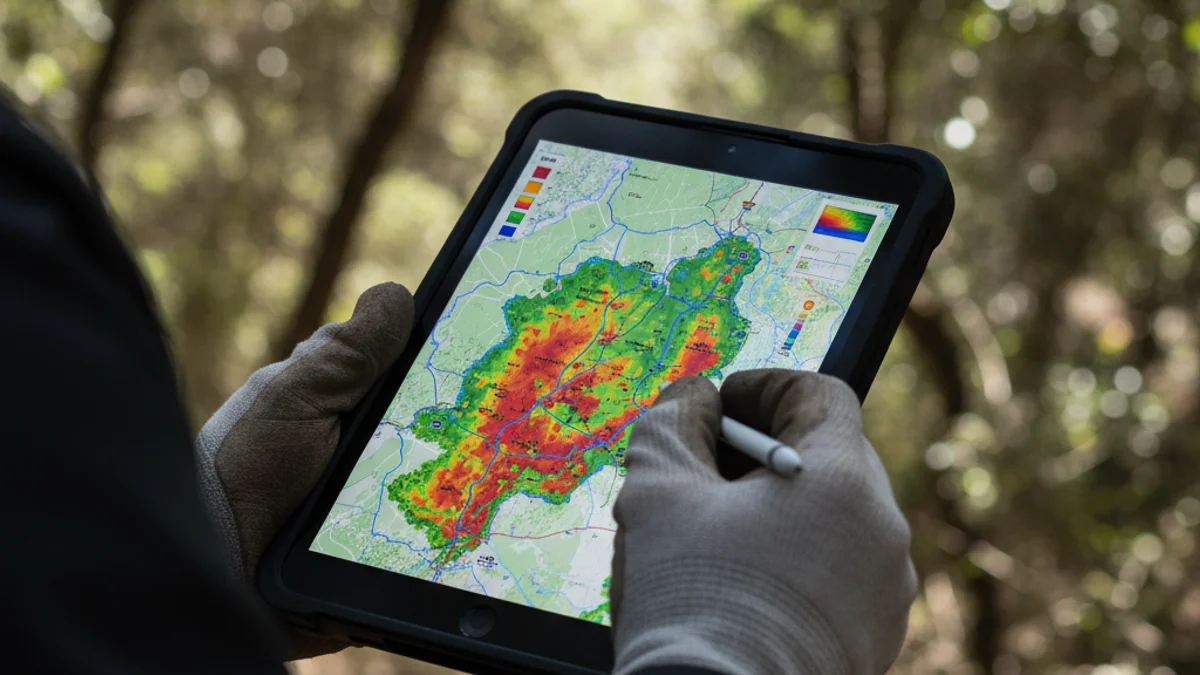 Imatge conceptual de la gestió forestal adaptativa, mostrant dades cartogràfiques sobre un bosc dens.