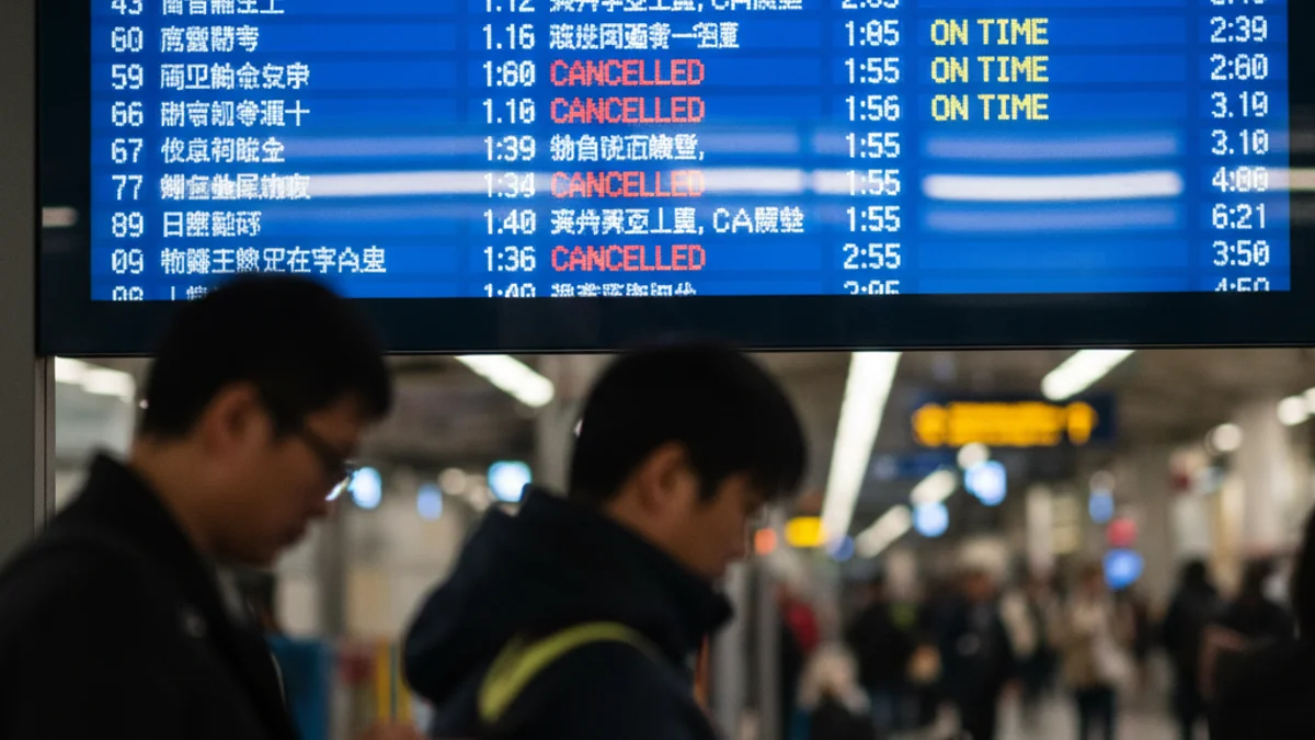 Panell d'informació d'una estació de tren mostrant retards i cancel·lacions, amb figures borroses de viatgers frustrats.