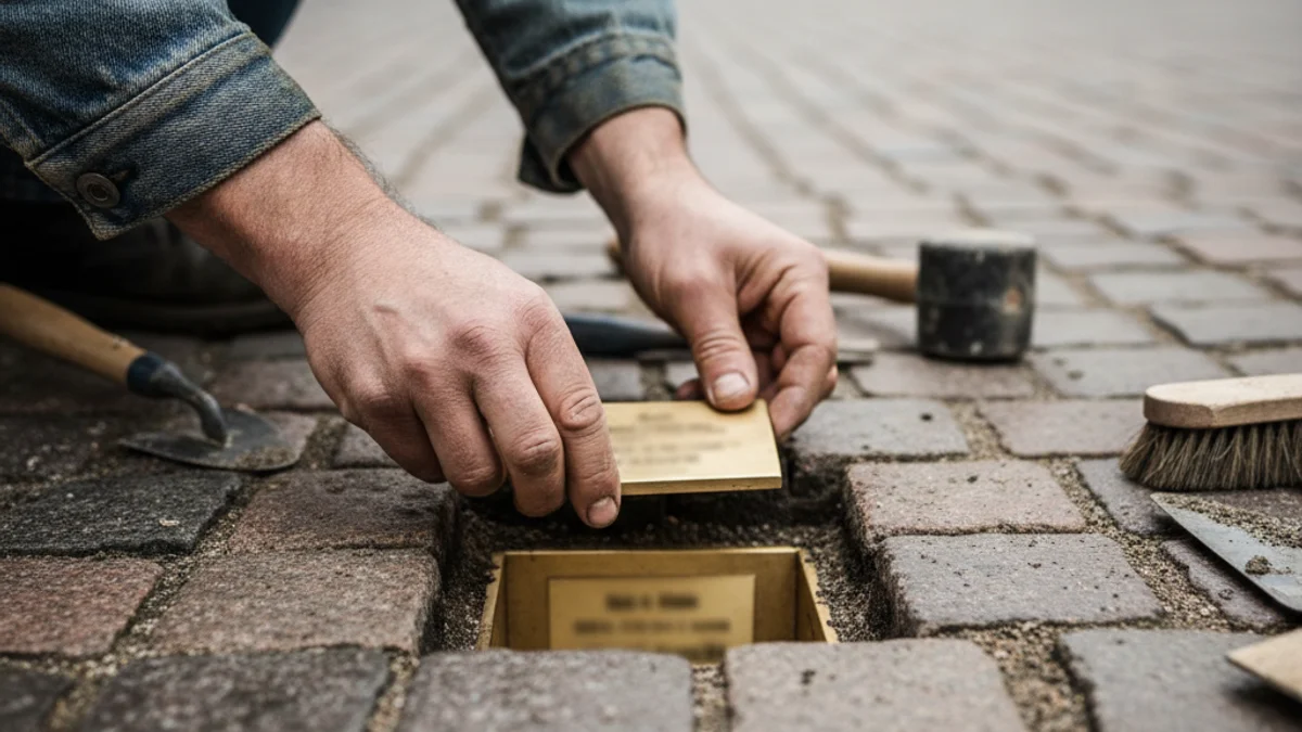Detall d'unes mans col·locant una llamborda de memòria Stolpersteine en un carrer empedrat.