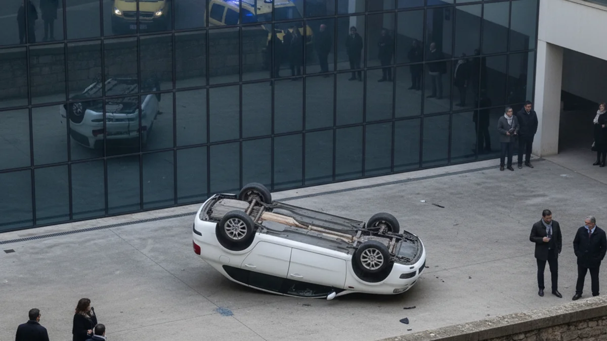 The accident occurred at 9:01 AM on March 4, right next to the Municipal Music School. The vehicle fell from a height of six meters and ended up completely upside down in the theater's interior area.