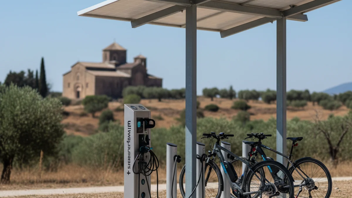 Each area features ten charging ports and a repair kit. The facilities are powered by solar panels, ensuring a 100% green energy supply for cyclists exploring the rural landscape.