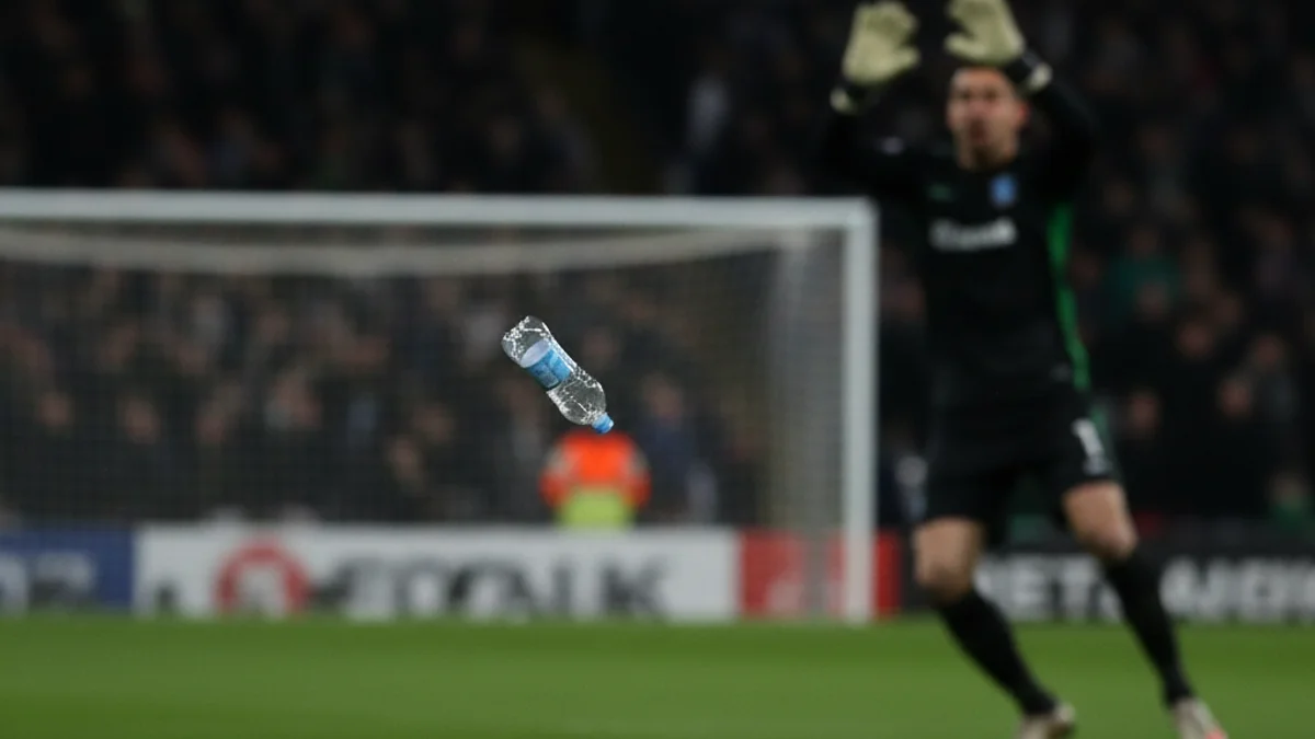Imatge genèrica d'un partit de futbol on es veuen objectes llançats des de la graderia cap a la gespa.