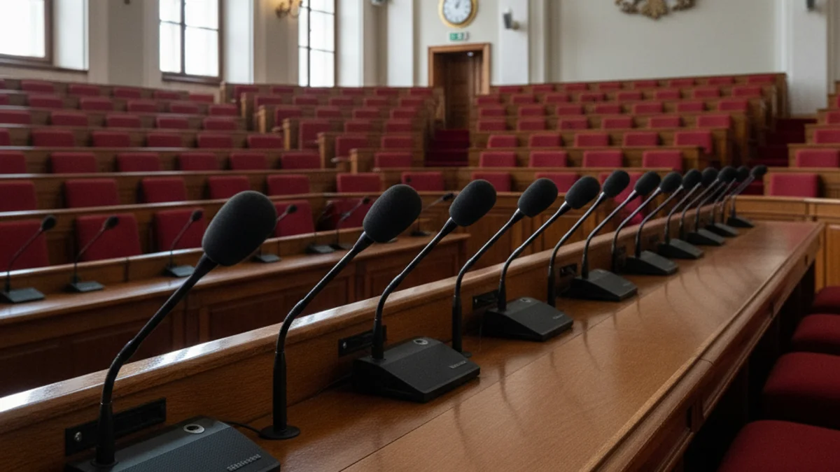 Imatge genèrica d'una roda de premsa política amb micròfons en un faristol buit.
