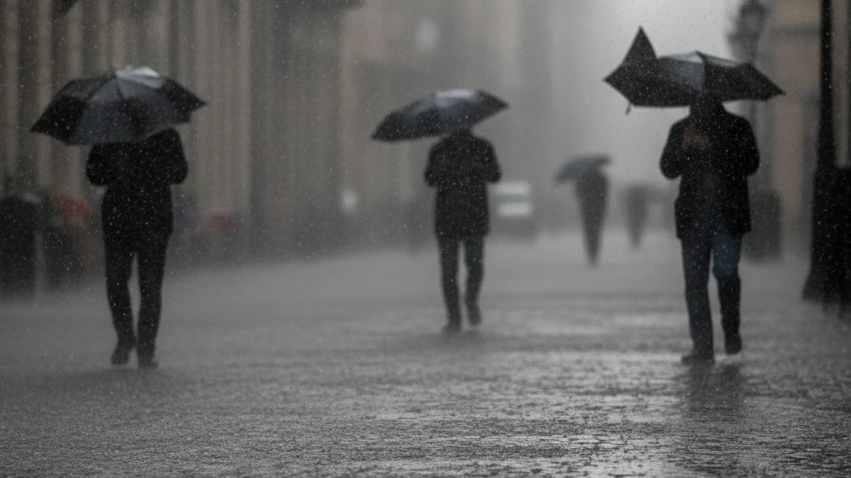 Imatge que mostra pluja intensa caient sobre una zona urbana, amb figures borroses lluitant contra el vent amb paraigües.