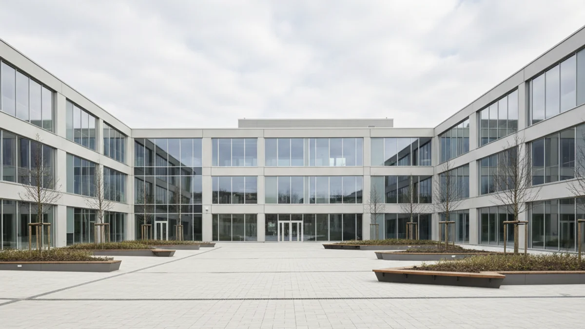 Façana d'una escola moderna amb finestres grans i un pati buit a Girona.