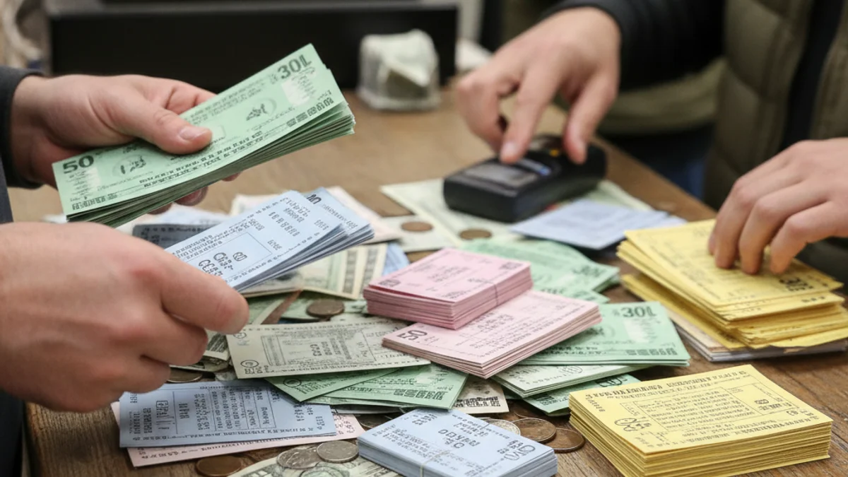 Una mà sostenint un dècim de loteria amb números borrosos sobre un fons de paperetes premiades.
