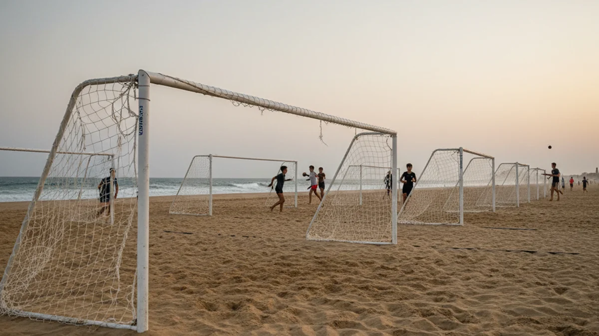 Vista general d'una platja amb camps de sorra preparats per a un torneig d'handbol platja amb figures borroses competint.