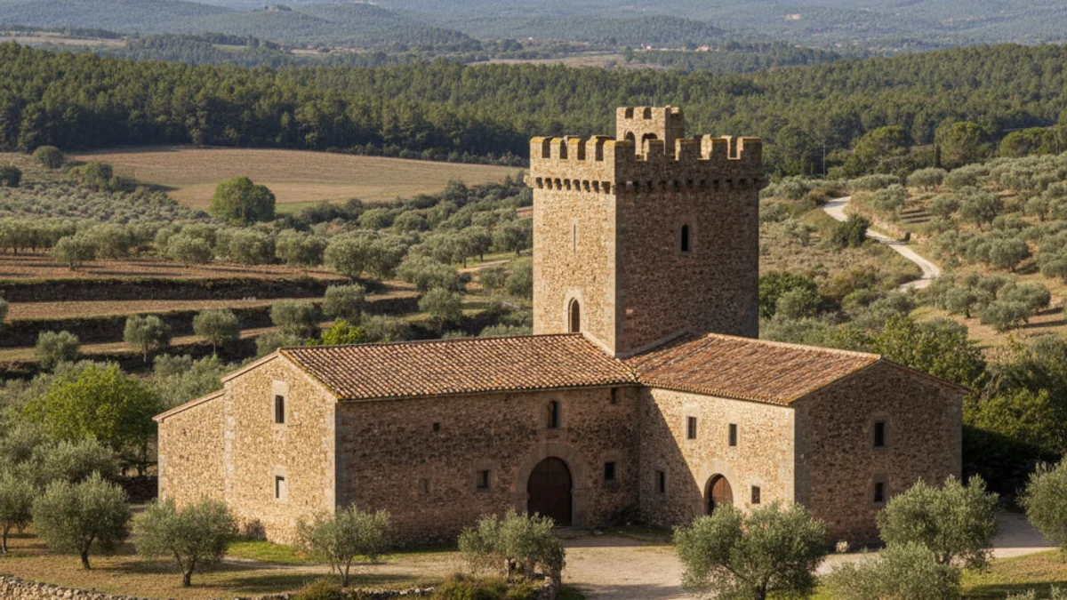 Vista genèrica d'una masia rural catalana amb una torre de defensa, envoltada de vegetació.