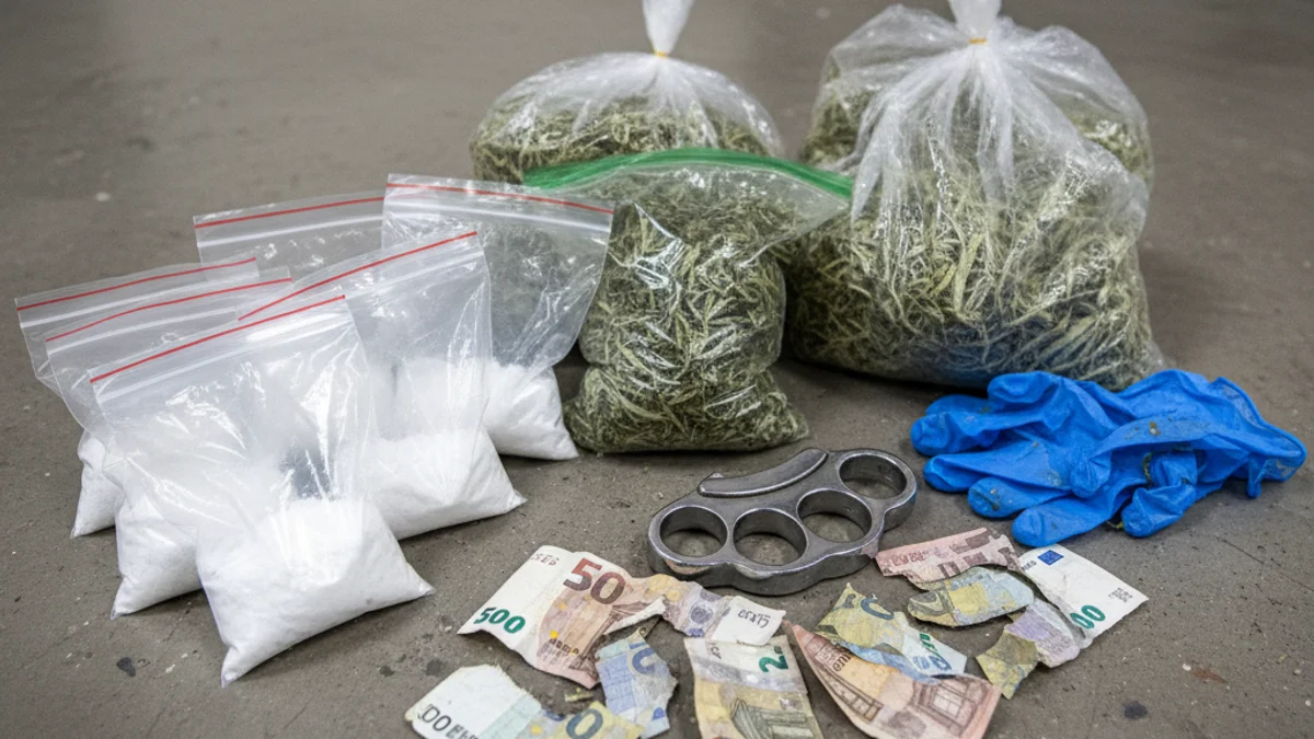 Intervenció policial amb substàncies estupefaents, diners i una arma prohibida sobre una taula.