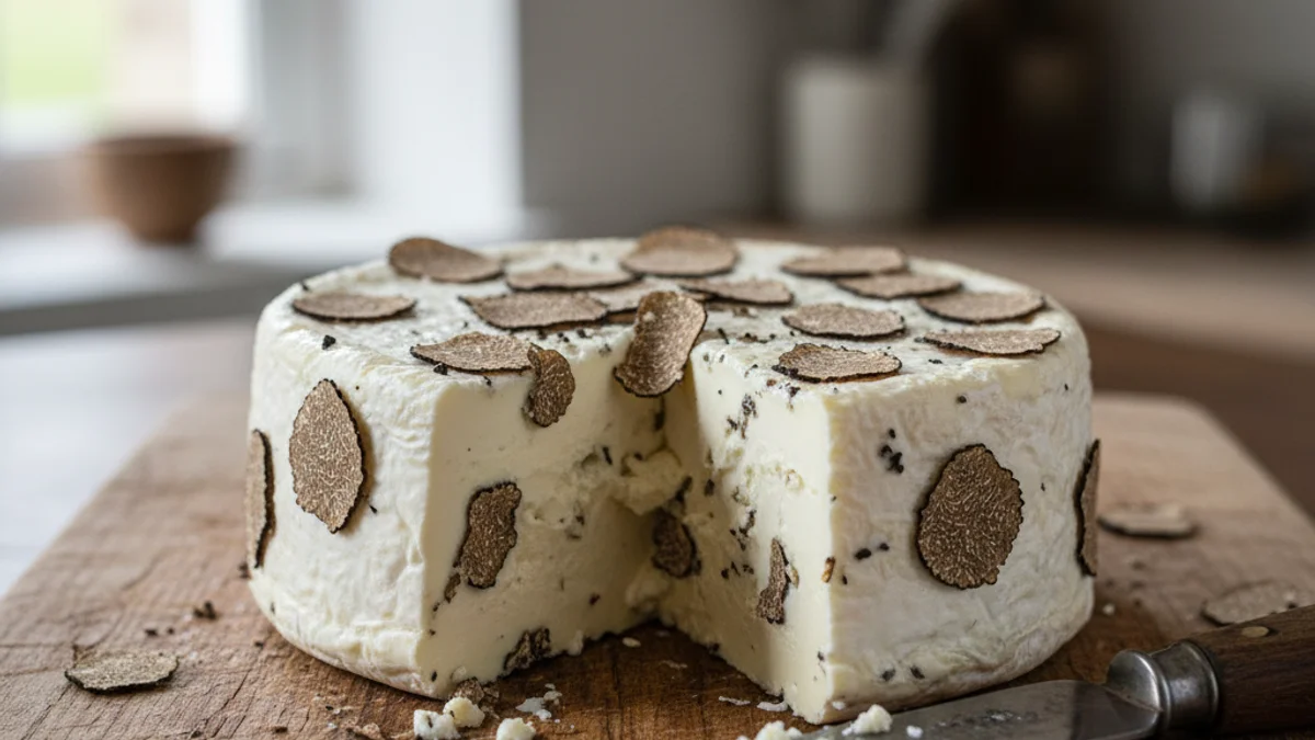 Primer pla d'un formatge de cabra trufat, amb tòfona d'estiu visible a la pasta.