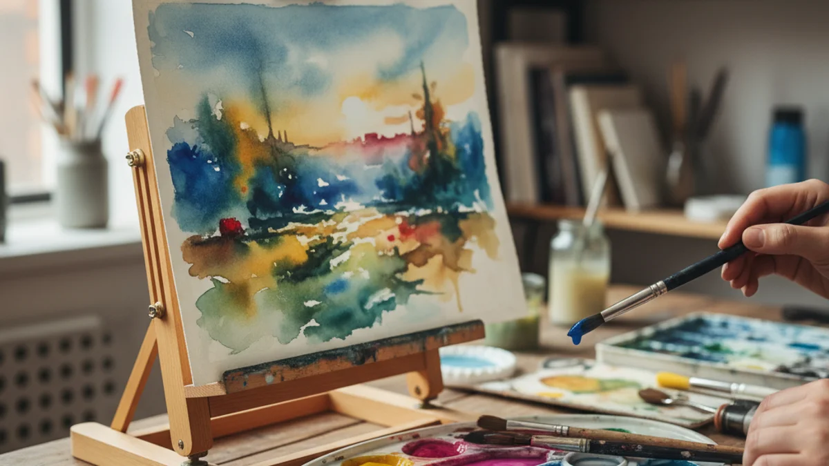 Detall d'una aquarel·la de paisatge domèstic amb pinzells i una paleta de colors al costat.