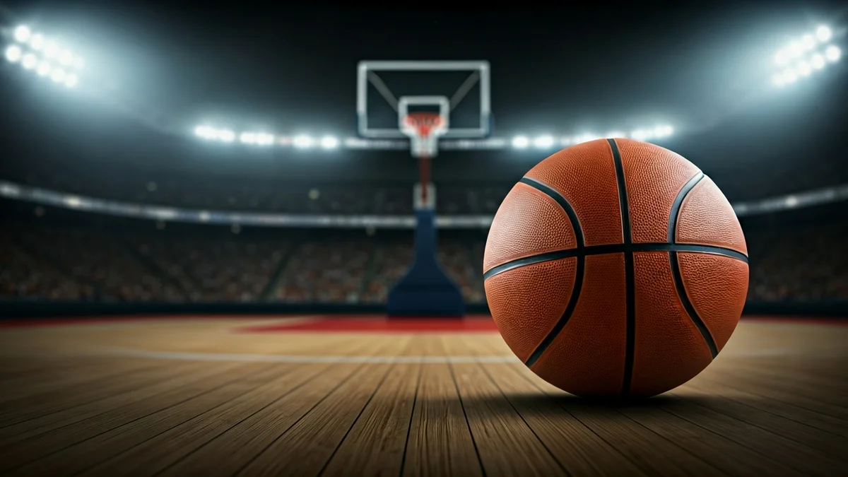 Imatge genèrica d'una pilota de bàsquet en una pista de fusta, amb un cèrcol de bàsquet desenfocat al fons.