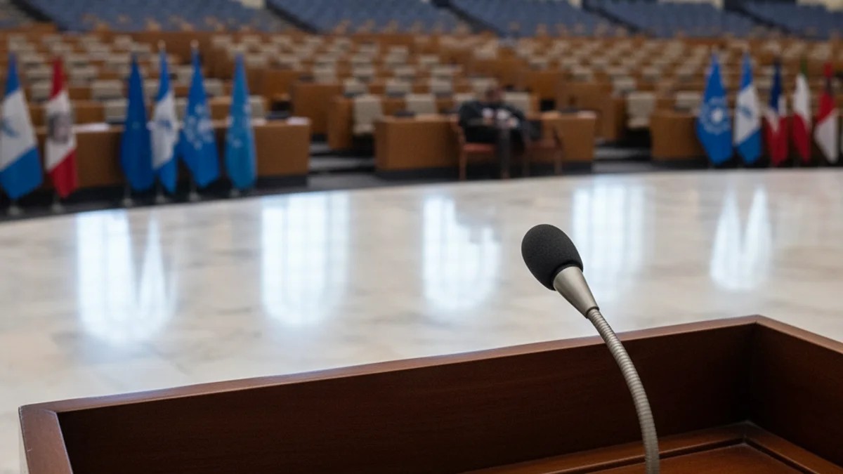 Imatge genèrica d'un faristol amb un micròfon en una sala d'assemblea internacional, símbol de debat polític.