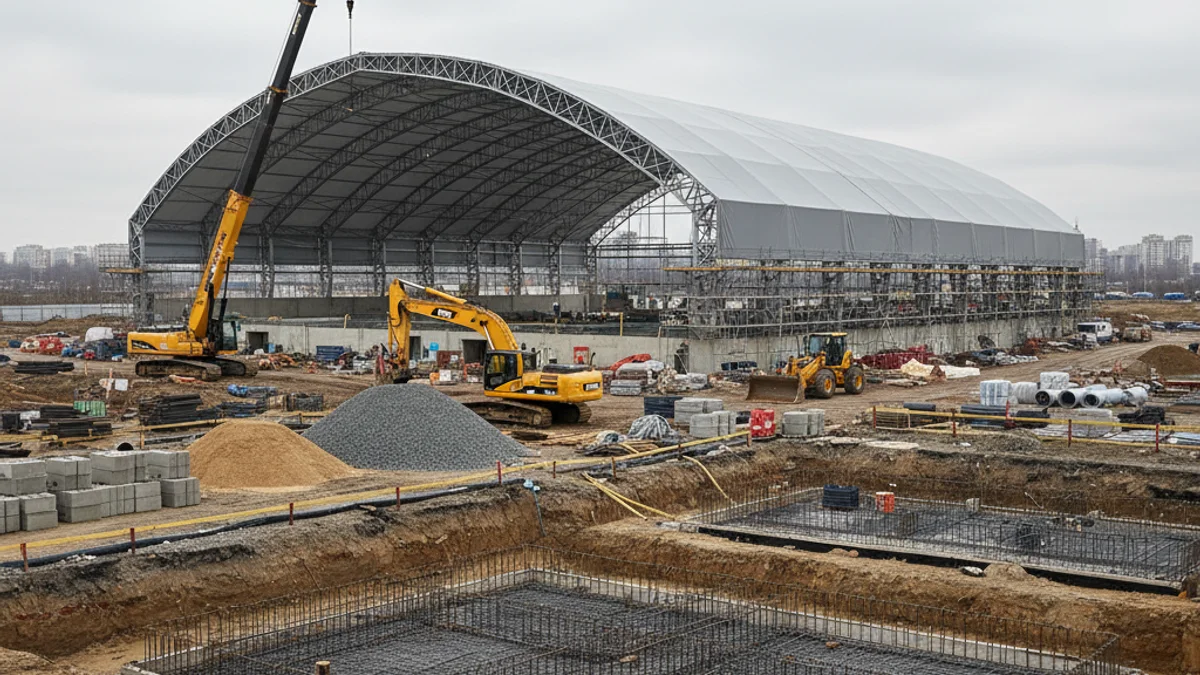 Imatge genèrica d'una obra de construcció amb maquinària pesada i estructures d'acer en un entorn urbà.