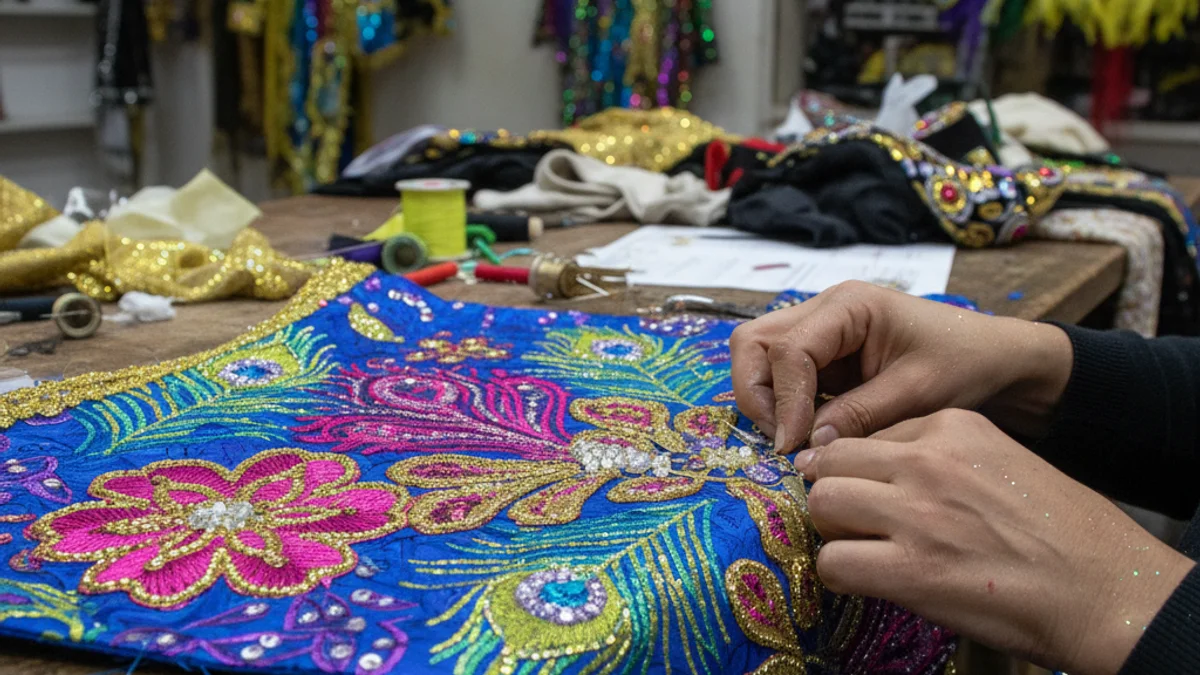 Detall de mans cosint meticulosament un vestit elaborat de comparsa per al Carnaval de Tarragona.
