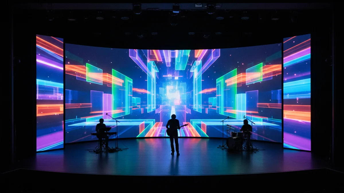 Escenografia futurista inspirada en videojocs projectada en un teatre fosc durant una representació d'òpera infantil.