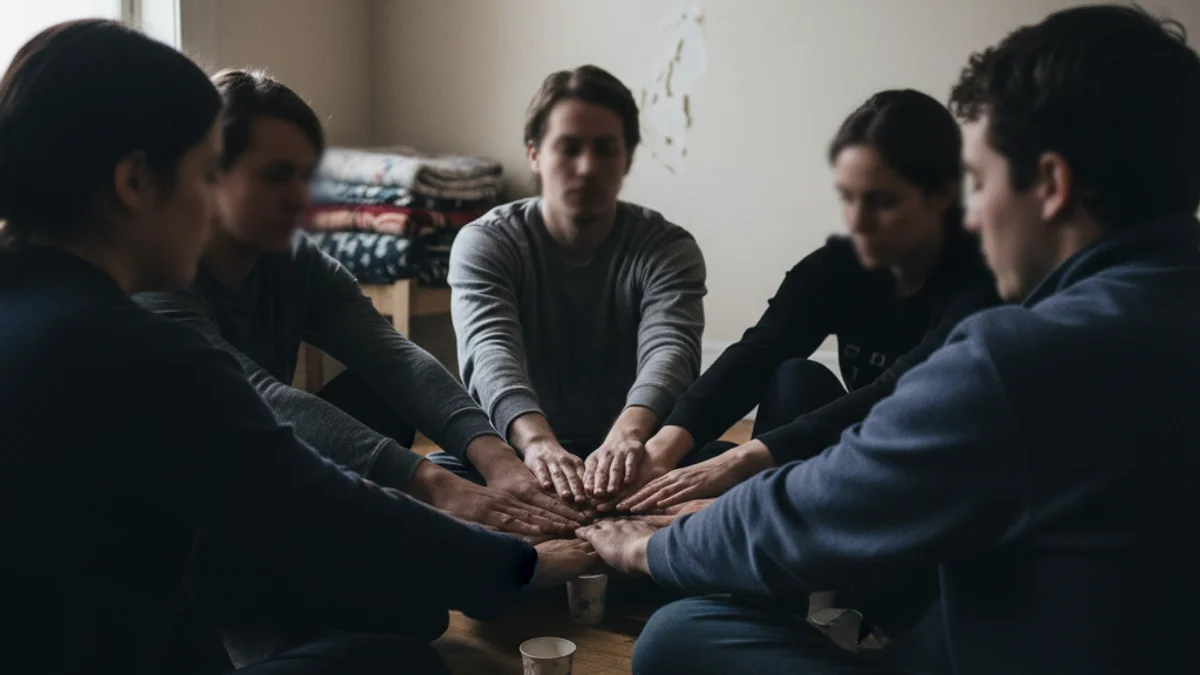 Grup de persones en una reunió de suport, amb siluetes borroses, simbolitzant l'ajuda mútua.