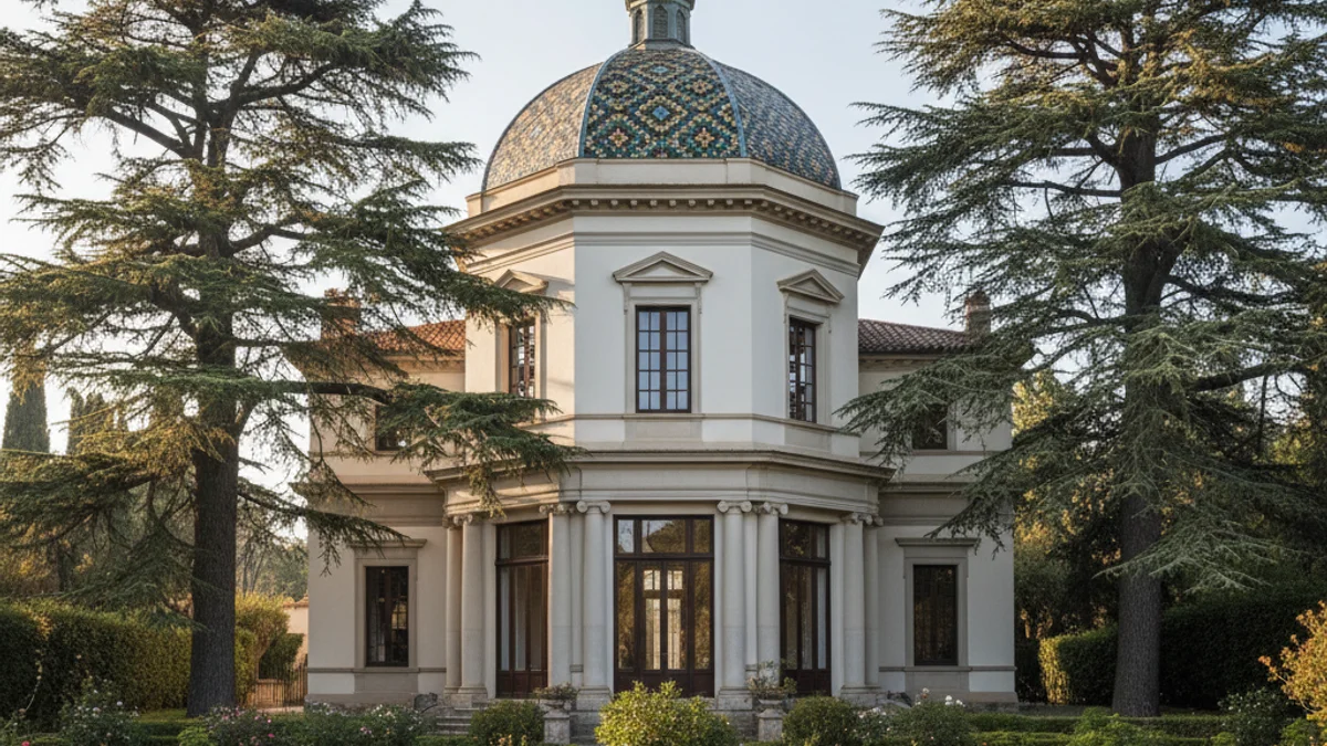 L'exterior de la finca compta amb porxos de columnes dòriques i un ampli jardí on destaquen dos cedres de grans dimensions, un de l'Atles i un de l'Himàlaia. La propietat inclou també un edifici annex de 80 m² i disposa d'un projecte de rehabilitació per mantenir l'essència arquitectònica original.