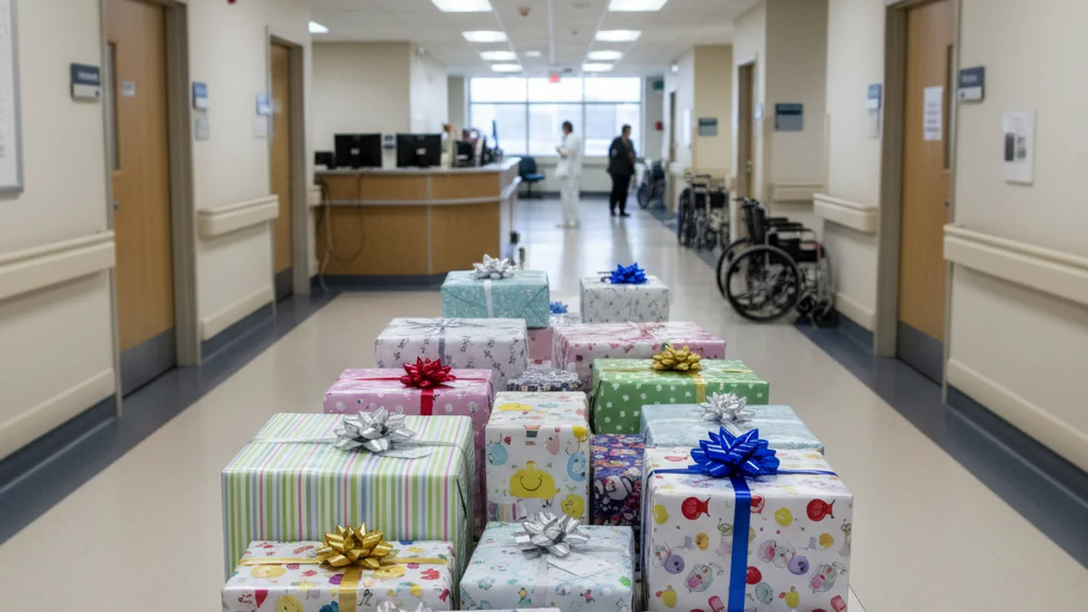 Jugadors del CE Sabadell entregant regals a la planta de pediatria d'un hospital, sense mostrar cares.