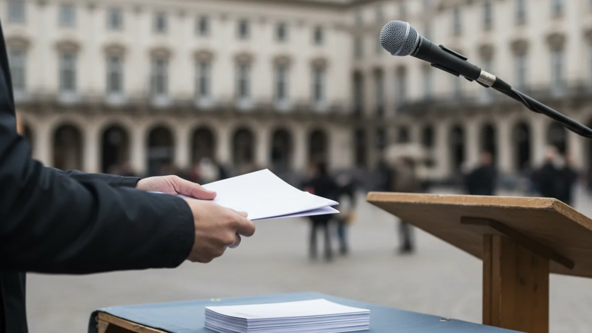 Representació genèrica d'un acte polític de carrer amb banderes i un faristol, sense figures reconeixibles.
